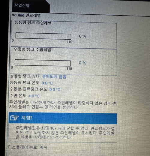 주입 레벨이 0%로 나온다. 이미 목까지 차있는데 0%라니! 레벨 외에는 다른 폴트 메모리는 존재하지 않았다.
